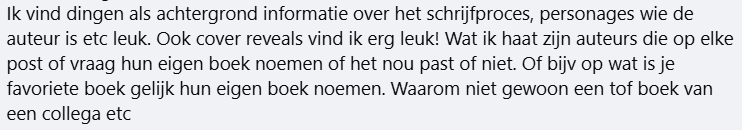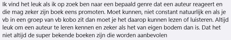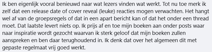 Zelfpublicerende auteurs klagen vervolgens dat ze nergens terecht kunnen. Dat is natuurlijk niet waar. Er zijn ook groepen die speciaal bedoeld zijn voor het promoten van boeken. Daar kun je je gang gaan, hoewel ik ook daar nog steeds niet ‘koop mijn boek’ zou roepen.
